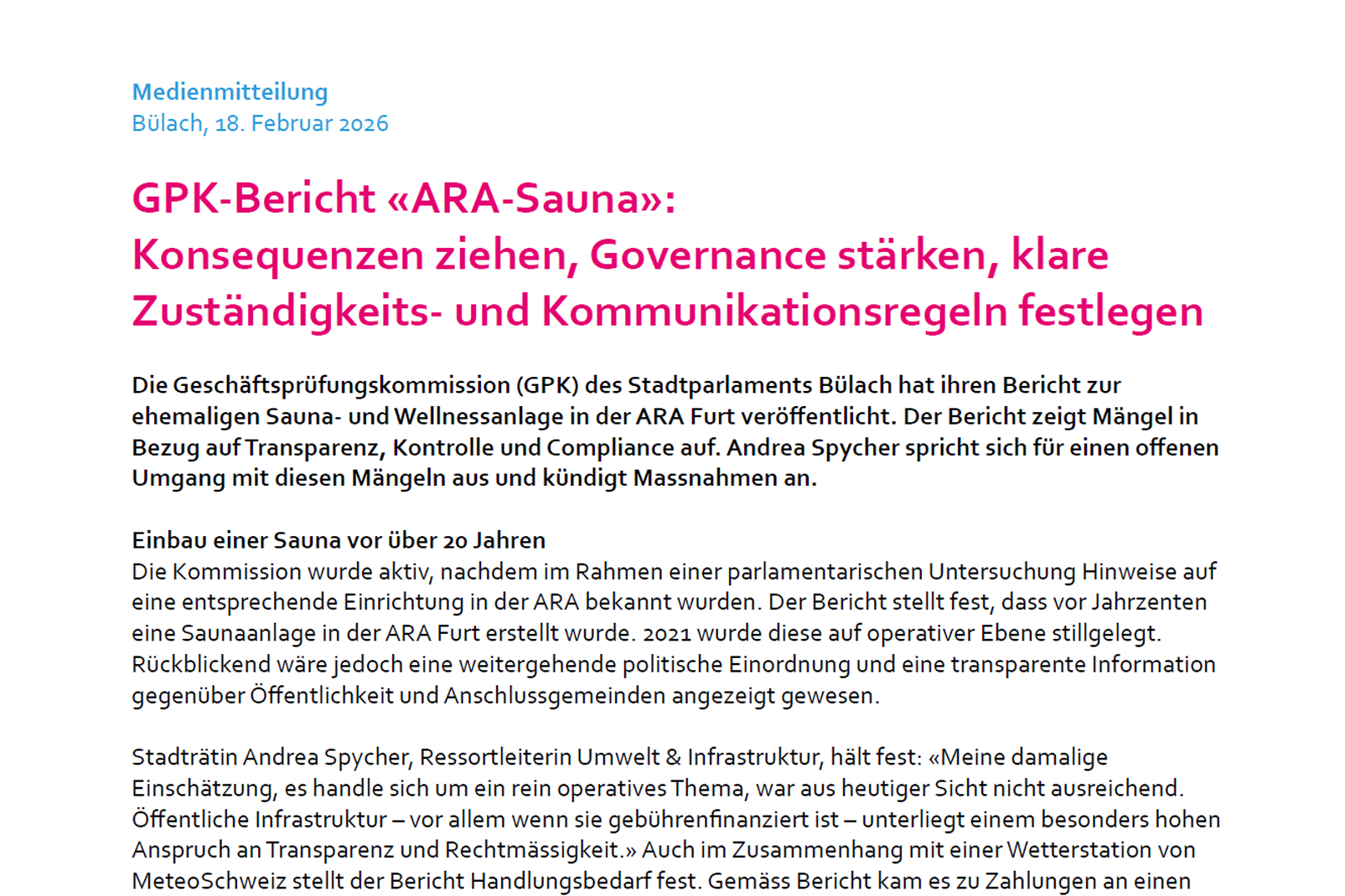 Die Geschäftsprüfungskommission (GPK) des Stadtparlaments Bülach hat ihren Bericht zur ehemaligen Sauna- und Wellnessanlage in der ARA Furt veröffentlicht. Der Bericht zeigt Mängel in Bezug auf Transparenz, Kontrolle und Compliance auf. Andrea Spycher spricht sich für einen offenen Umgang mit diesen Mängeln aus und kündigt Massnahmen an.