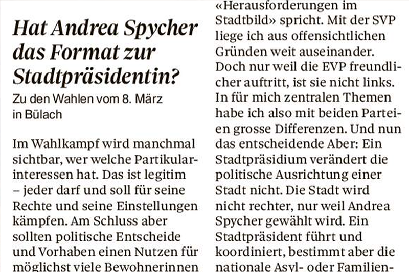 Im Tages-Anzeiger spreche ich über meine Kandidatur fürs Stadtpräsidium Bülach, mein Wahlkomitee und die breite Unterstützung über Parteigrenzen hinweg.
