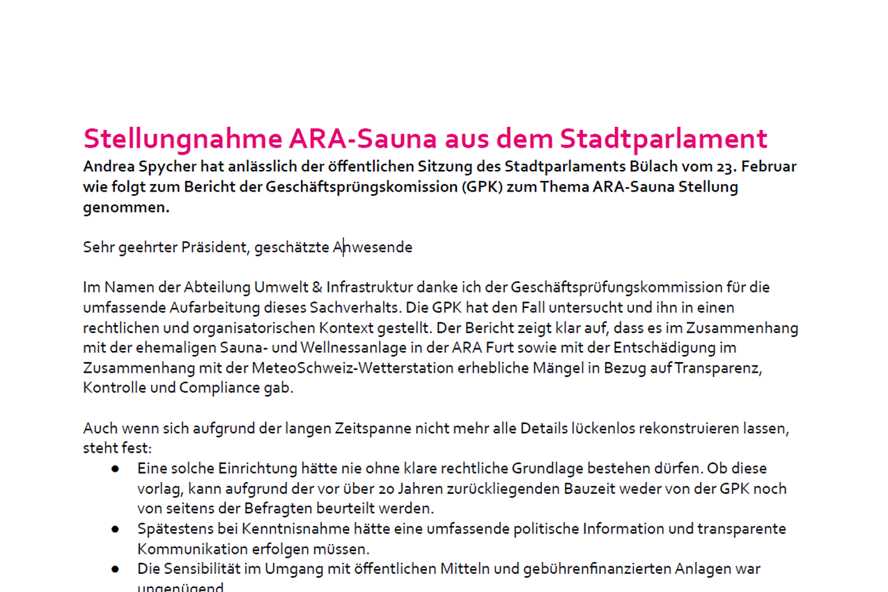Andrea Spycher hat anlässlich der öffentlichen Sitzung des Stadtparlaments Bülach vom 23. Februar wie folgt zum Bericht der Geschäftsprüngskomission (GPK) zum Thema ARA-Sauna Stellung genommen.